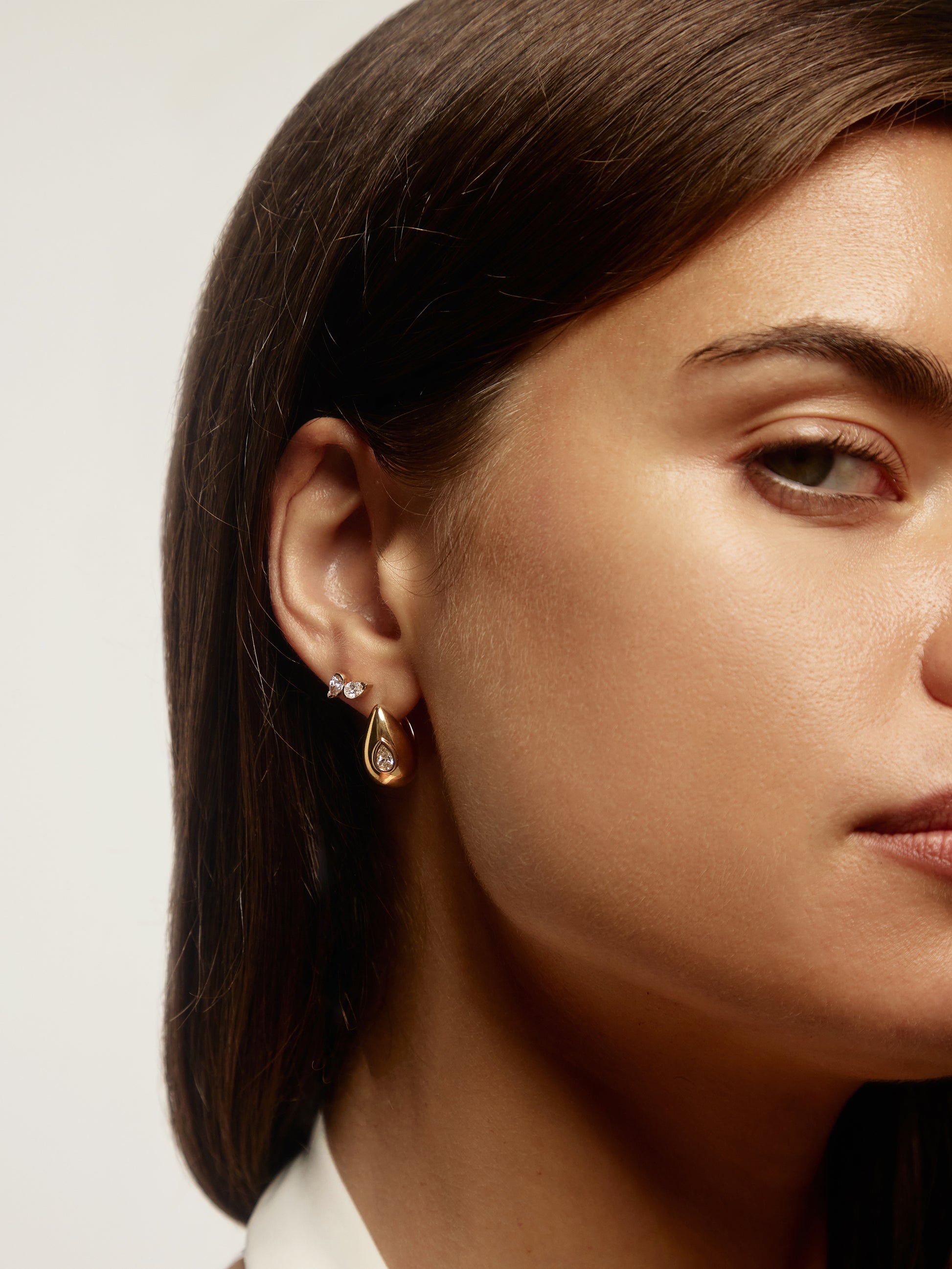 The ARI earrings - bold, sculptural forms in solid 9k or 18k yellow gold. A single pear-cut lab-grown diamond, discreetly bezel-set on one side, adds unexpected asymmetry and intrigue. Minimal and intentional.