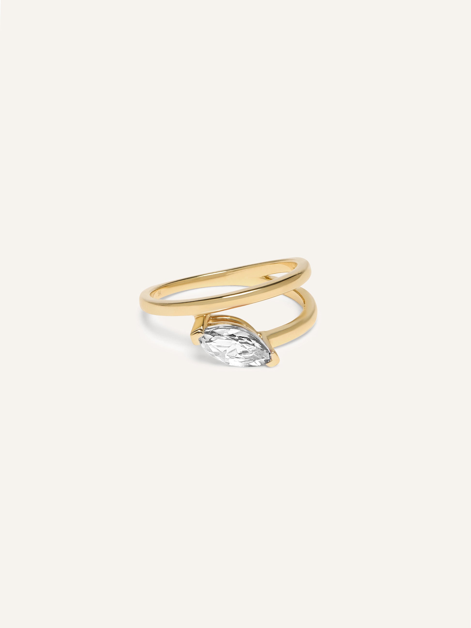 A bold take on classic form. The RUBI ring features a marquise-cut diamond, angled within an open basket and set on a sculptural double band of 9k or 18k yellow gold. A standalone piece with presence - designed to sit flush within the RUBI wrap ring, this ring is a statement of romance, refined sophistication and a touch of playful charm.